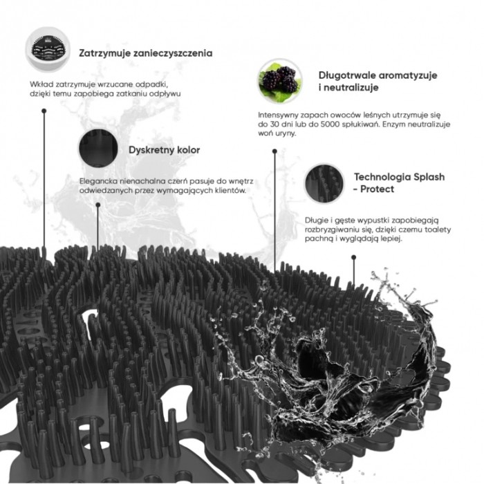 - Najwyższej jakości zapchowo-enzymatyczna wkładka do pisuaru, o długo utrzymującym się zapachu - Podczas używania wydziela subtelny i delikatny zapach, przez około 30 dni - Nieprzyjemny odór uryny jest niwelowany przez specjalną kompozycję wyselekcjonowanych zapachów wraz z jednoczesnym enzymatycznym rozkładem mocznika - Wkładki żelowe zabezpieczają przed zapchaniem się odpływu i pasują praktycznie do większości pisuarów wodnych i bezwodnych - Zaprojektowane tak, aby zapobiegały przed rozbryzgiwaniem moczu (długie i gęste wypustki), co w konsekwencji zmniejsza zabrudzenia samego pisuaru i w znaczący sposób ułatwia jego sprzątanie - Wkładka wydziela subtelny zapach, który niweluje nieprzyjemny odór uryny - Zapach utrzymuje się przez około 30 dni - Posiada możliwość ustawienia daty - Zapach: jeżyna