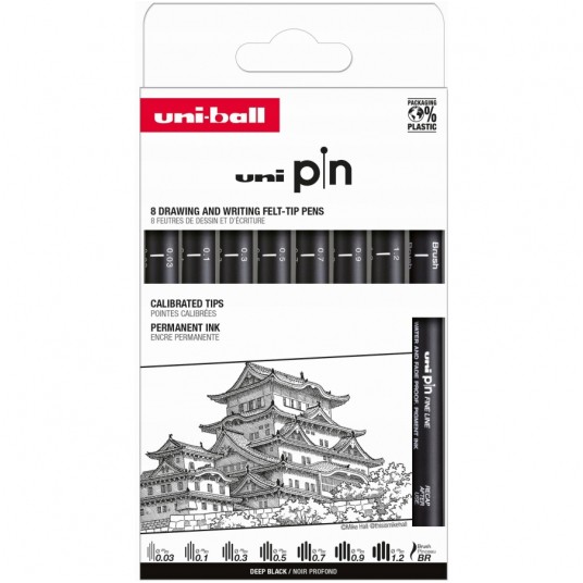 - Zestaw 8 cienkopisów kreślarskich marki Uni-ball, stworzony z myślą o artystach, projektantach i rysownikach poszukujących najwyższej precyzji i wszechstronności w swojej pracy - Każdy cienkopis zawiera trwały, wodoodporny tusz, który gwarantuje intensywną i wyraźną czerń, doskonale sprawdzającą się na różnych powierzchniach - W zestawie znajdują się cienkopisy o różnych grubościach końcówek: - 0,05 mm – do ultradrobnych detali - 0,2 mm – do rysunków precyzyjnych - 0,4 mm – do konturów i szkiców - 0,6 mm – do rysowania wyraźniejszych linii - 0,8 mm – do bardziej wyrazistych konturów - 1,0 mm – do pogrubionych linii - 1,2 mm – do mocniejszych akcentów - Pędzelek – do elastycznych linii i efektów malarskich - Kolor: czarny - Ilość sztuk w zestawie: 8