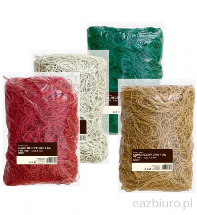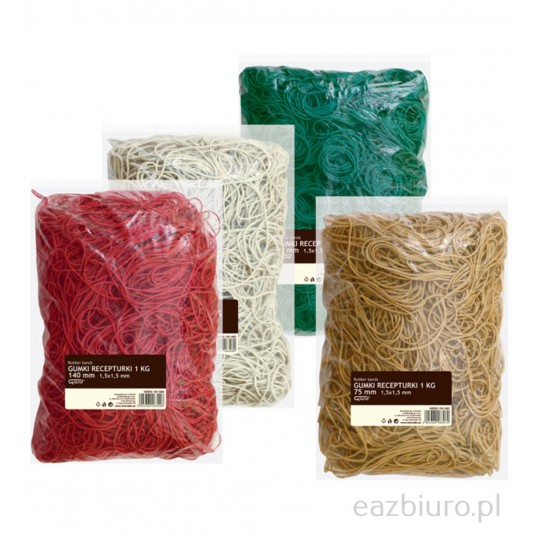 – elastyczne gumki – dostępne w 4 kolorach: naturalnym, czerwonym, zielonym oraz białym – pakowane w woreczki – rozmiar: 1,5 x 1,5 mm – średnica: 60 mm – długość po złożeniu: 9 cm – opak. 1 kg