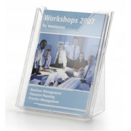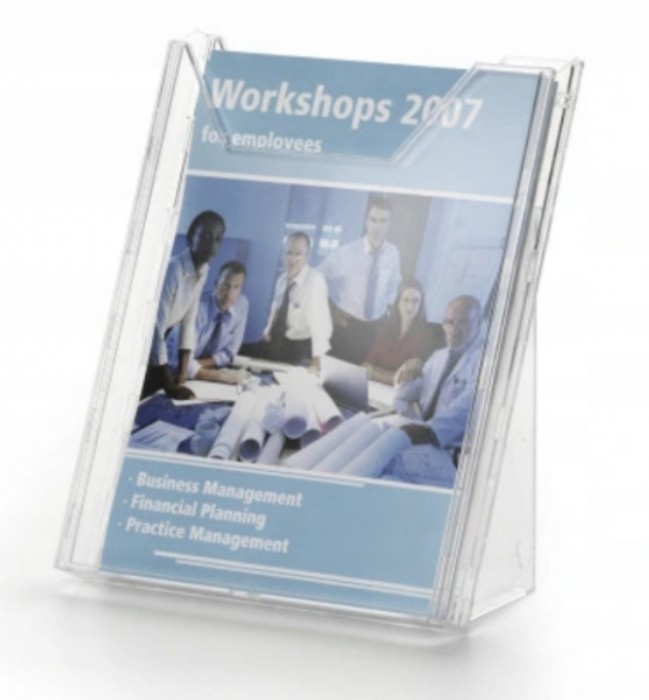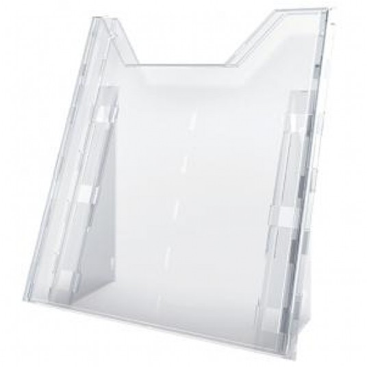 - System półek na prospekty w formacie A4 i 1/3 A4 - Wszystkie zestawy półek wyposażone są w specjalne nóżki, które w zależności od sposobu ich umieszczenia tworzą zestaw na biurko lub na ścianę - Możliwość tworzenia wielu kombinacji - Półka na katalogi A4, wymiary: 311 x 240 mm - Wyposażona w specjalne podstawki, które po wsunięciu do prowadnicy znajdującej się na tylnej ściance półki pozwalają na korzystanie z półki na biurku