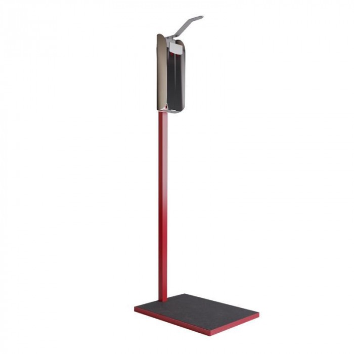 Dozownik został wykonany ze stali kwasoodpornej. Wyposażony jest w pojemnik na płyn antyseptyczny oraz pompkę wykonaną z wysokiej jakości tworzyw sztucznych