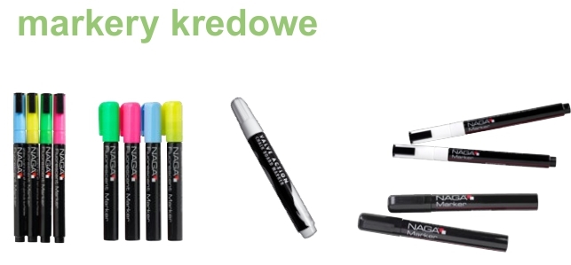 Dostępne również akcesoria dedykowane tablicom NAGA®: markery kredowe, uchwyty do markerów oraz . magnesy.