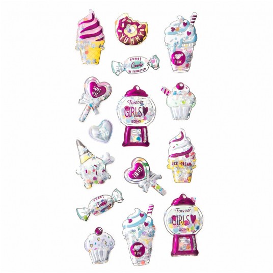 - Naklejki shaker 3D z rozmaitych słodkości takich jak lody, lizaki i cukierki to absolutny HIT, doskonały do zdobienia, albumów kartek okolicznościowych, zaproszeń czy też opakowań prezentowych - Każda naklejka ma wypukłą, przezroczystą kopułkę i wypełniona jest kolorowym, opalizującym konfetti w kształtach serduszek i gwiazdek - Naklejki te będą idealnym wykończeniem projektów urodzinowych takich jak zaproszenia czy kartki z życzeniami - Sprawdzą się również przy kreatywnej zabawie z dziećmi - Wybierając naklejki shaker z pewnością uzyskasz efekt WOW na swoich pracach - Liczba naklejek w opakowaniu: 15 szt. - Wielkość blistra: 9 x 17,5 cm - Wielkość naklejek: od 1,5 x 1,5 cm do 4 x 2,8 cm - Cechy szczególne: naklejki 3D z przezroczystymi kopułkami wypełnionymi konfetti