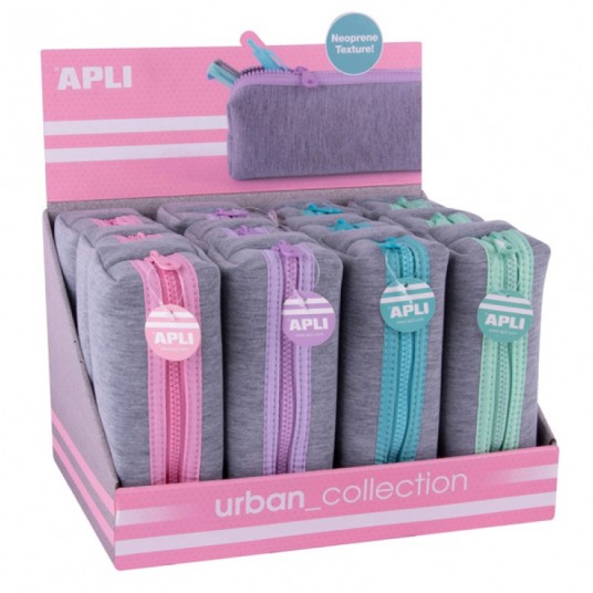 Display prostokątnych piórników neoprenowych z kolekcji Urban, z wykończeniem Vigore. Każdy display zawiera 12 wysokiej jakości i trwałych szarych neoprenowych piórników z zamkiem błyskawicznym w 4 pastelowych kolorach. Rozmiar 60 x 80 x 180 mm (szerokość x wysokość x długość), posiada prążkowane szwy i wzmocniony zamek błyskawiczny dla dodatkowej trwałości. Kolor: różowy, liliowy, turkusowy, zielony.