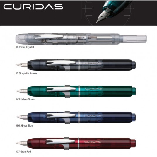 Pióro wieczne japońskiej marki Platinum z kolekcji Curidas, kolor Graphite Smoke. Pióro wieczne marki Platinum z kolekcji Curidas zdecydowanie różni się od wielu tradycyjnych piór wiecznych. Curidas to połączenie japońskiego słowa Kuridasu odnoszącego się do przedłużenia końcówki pióra i słowa Curiosity. To nowe pióro wieczne zostało powołane do życia, aby zaspokoić ciekawość ludzi. Przyciskowy mechanizm wysuwu stalówki jest bardzo wygodny. Pióro jest natychmiast gotowe do działania, bez potrzeby zdejmowania skuwki. Kolejne kliknięcie powoduje schowanie stalówki i kiedy jest w tej pozycji, uszczelniona, zrobiona z miękkiego materiału komora na stalówkę, zapewnia nieprzepuszczalność powietrza. Specjalnie zaprojektowany klips, który można łatwo usunąć nie przeszkadza podczas pisania. Przezroczysta żywica pozwala zobaczyć wnętrze pióra. Curidas to idealne pióro dla osób ceniących ciekawe, techniczne rozwiązania. Pióro wieczne umieszczone jest w eleganckim firmowym pudełku. Posiada nabój atramentowy na strat.
