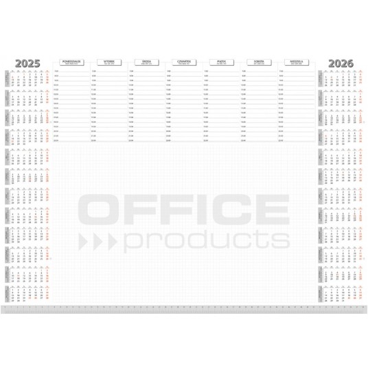 oryginalny projekt zgodny z zasadami organizacji czasu pracy: po lewej stronie kalendarz na 2025 rok, po prawej stronie kalendarz na 2026 rok, na czerwono oznaczone dni wolne, u góry rozkład tygodnia, godziny od 7.00 do 20.00, pod kalendarzem tygodniowym powierzchnia w kratkę przeznaczona na notatki