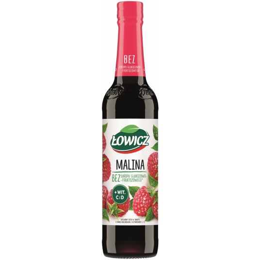 syrop Łowicz o smaku malinowym to idealny sposób na orzeźwienie latem lub rozgrzanie zimą bez syropu glukozowo-fruktozowego bez konserwantów z dodatkiem witamin C i D z korkiem niekapkiem składniki: cukier, woda, sok malinowy z zagęszczonego soku malinowego 1 %, koncentrat czarnej marchwi, regulator kwasowości – kwas cytrynowy; witamina C, witamina D, aromat pojemność: 400 ml