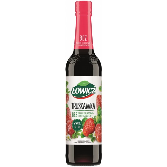 syrop Łowicz o smaku truskawkowym to idealny sposób na orzeźwienie latem lub rozgrzanie zimą bez syropu glukozowo-fruktozowego bez konserwantów z dodatkiem witamin C i D z korkiem niekapkiem składniki: cukier, woda, sok truskawkowy z zagęszczonego soku truskawkowego 4,5 %, koncentrat czarnej marchwi, regulator kwasowości – kwas cytrynowy, witamina C, witamina D, aromat pojemność: 400 ml