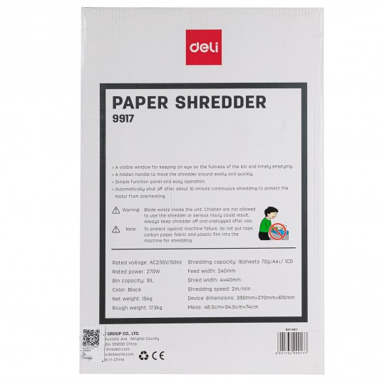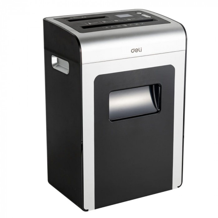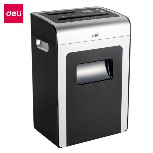 Niszczarka Deli E9917-EU to model przeznaczony do niszczenia dokumentów, charakteryzujący się wejściem o szerokości standardowego papieru A4. Niszczy jednorazowo do 16 kartek (A4/70g) na paski o wymiarach 4 x 40 mm, a jej kosz na ścinki ma pojemność 31 litrów. Urządzenie pracuje w trybie cichym (Mute Operation) i oferuje 10 minut ciągłej pracy.
