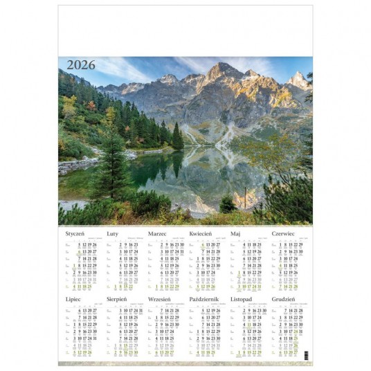 - Kalendarz plakatowy formatu A1 (594 x 841 mm) - Kalendarium z imionami - Wydrukowany na papierze powlekanym (kreda) 170 g/m2 - Oprawiony w metalowe listwy z otworem - Pole pod nadruk formatu 594 x 115 mm