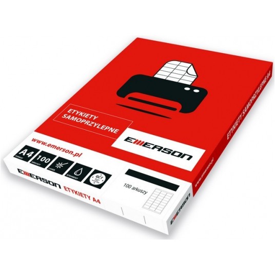 - białe, samoprzylepne dostarczane są na arkuszach o formacie A4 - współpracują ze wszystkimi rodzajami drukarek igłowych, atramentowych i z większością drukarek laserowych (patrz zalecenia producenta drukarki) - dostępne w wersji z tzw. Quatro Clean Technology - tj. z krawędziami bezpieczeństwa, które zapobiegają odkładaniu się kleju na mechanizmie drukarki R2 - etykiety o zaokrąglonych rogach - niektóre formaty etykiet dostępne również w opakowaniach po 1000 arkuszy - w kartonie znajduje się 10 opakowań - na stronie www.emerson.pl dostępne są szablony do zadruku etykiet