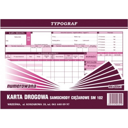 Druk karta drogowa na samochody ciężarowe sm102 numerowana A4