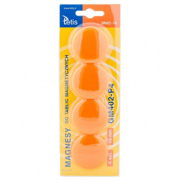 - Magnesy Tetis są niebywale mocne i trwałe, zapewniają prosty i praktyczny sposób przymocowania dokumentu lub notatki do powierzchni magnetycznych - Doskonałe do tablic i innych powierzchni magnetycznych - Pakowane na blistrze - Średnica: 40 mm - Kolor: pomarańczowy - Wzór: gładkie - Ilość: 4 sztuki