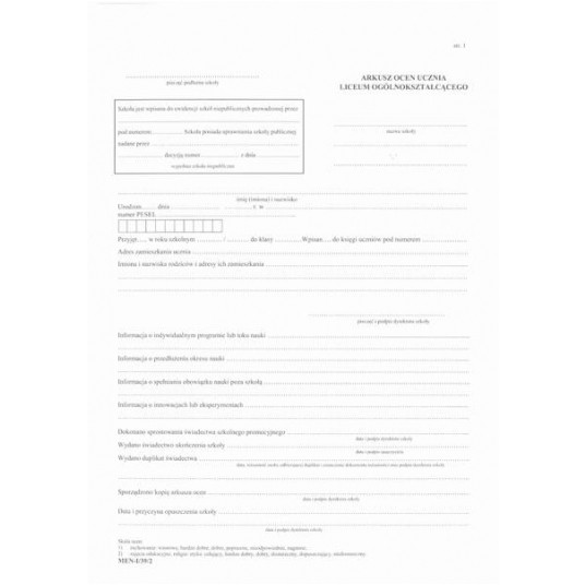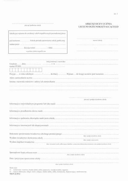 Druk arkusz Ocen dla uczniów liceum ogólnokształcącego dla młodzieży men-i/39/2
