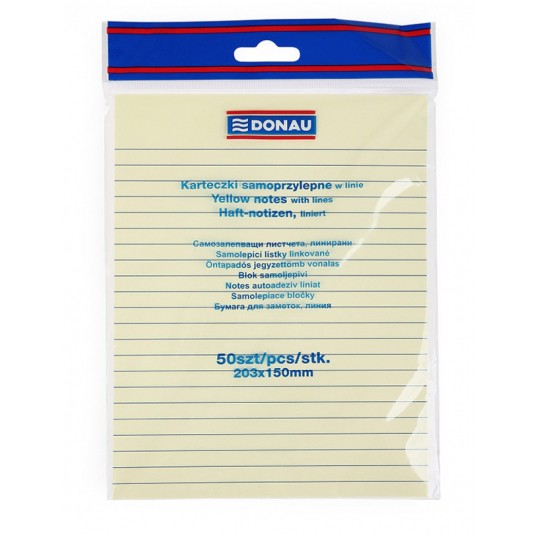 - Notes samoprzylepny, idealne do przekazywania wiadomości - Ilość karteczek: 50 - Gramatura: 75gsm - Karteczki w żółtym kolorze z nadrukowanymi liniami - Klej na bazie wody, umieszczony wzdłuż krótkiego boku - Rozmiar: 150x203mm - Można wielokrotnie przyklejać i odklejać - Kolor żółty