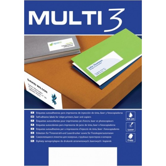 - Uniwersalne etykiety samoprzylepne, kompatybilne z drukarkami atramentowymi, laserowymi i kserokopiarkami - Rozmiar etykiety: 97x42,4mm - Liczba etykiet na arkuszu: 12 - Gramatura: front 70gsm, podkład 55gsm - Białość: 150 CIE - Szeroki wybór rozmiarów etykiet - Etykiety MULTI3 można zaprojektować i wydrukować za pomocą bezpłatnego programu w języku polskim APLI SOFT PRO SE dostępny na apli.com lub pbspolska.eu - 100 arkuszy w j.s. - Kolor biały