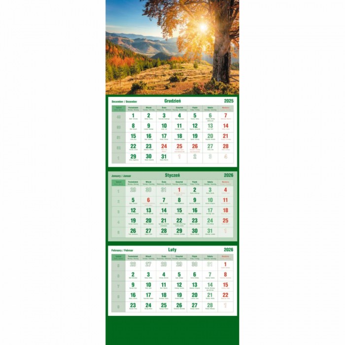 - Układ kalendarium: 1 miesiąc - 1 kartka