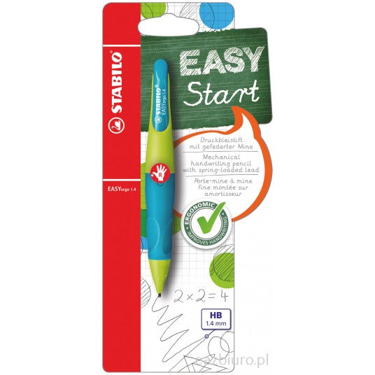 - STABILO EASYergo 1.4 - ergonomiczny ołówek automatyczny dla dzieci i młodzieży od 8 roku życia. - Dostępny jest w 2 wersjach, dla osób prawo- i leworęcznych. - Uchwyt ołówka wykonany jest z materiału antypoślizgowego, co zwiększa komfort użytkowania. - Niska waga redukuje nakład potrzebnej siły i ułatwia posługiwanie się ołówkiem. - Grafit o twardości HB. - Ołówek dostępny jest w 4 kombinacjach kolorystycznych. - Wersja dla praworęcznych. - Kolor obudowy zielony/turkusowy.
