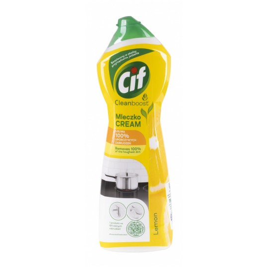- Bezwzględne dla brudu, przyjazne dla Twojego domu. - Mleczko Cif ze 100% naturalnymi cząsteczkami czyszczącymi usuwa całkowicie najbardziej oporny brud jak: przypieczony tłuszcz, przypalone jedzenie, plamy z kamienia w łazience, nie niszcząc powierzchni oraz nie pozostawiając smug - Butelka w 100 % nadają się do recyklingu - 780g - Zapach: Lemon