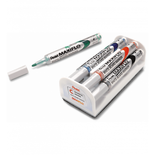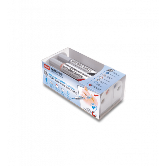 - Marker MAXIFLO do białych i ceramicznych tablic. - Płynny tusz dozowany w razie konieczności nawilżenia końcówki za pomocą tłoczka (zamiast tradycyjnego sączka). - Marker pisze wyrazistą linią aż do ostatniej kropli tuszu. - Kilkakrotnie dłuższa linii pisania niż w standardowych markerach z sączkiem - 1200 m. - Nie zawiera substancji trujących ksylenu ani toluenu. - Nadaje się na papier, plastik, karton, tablice suchościeralne. - Zestaw MWL5S-4N zawiera 4 markery (czarny, czerwony, niebieski, zielony) oraz gąbkę magnetyczną.