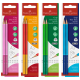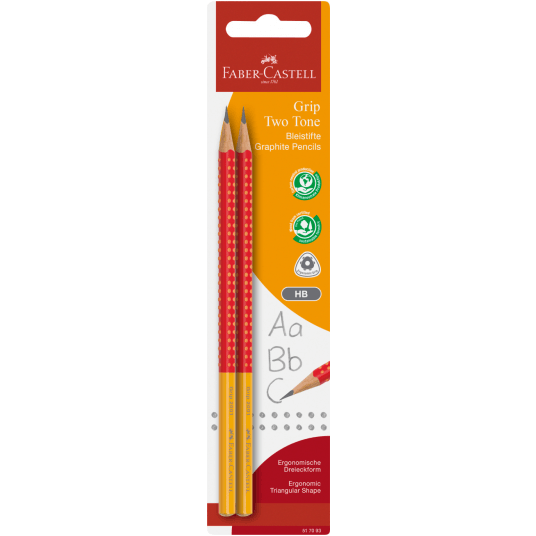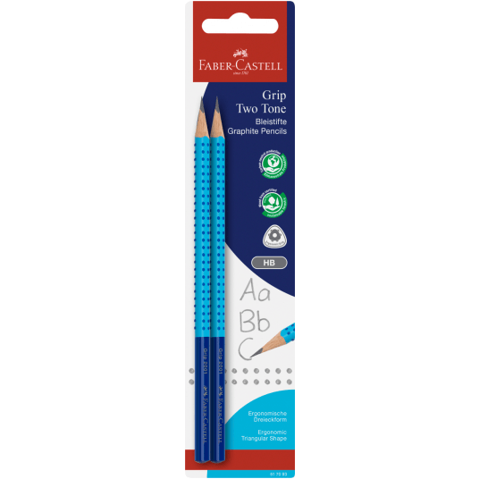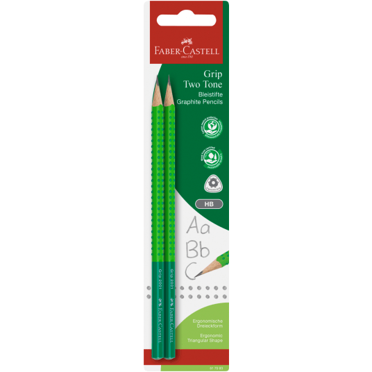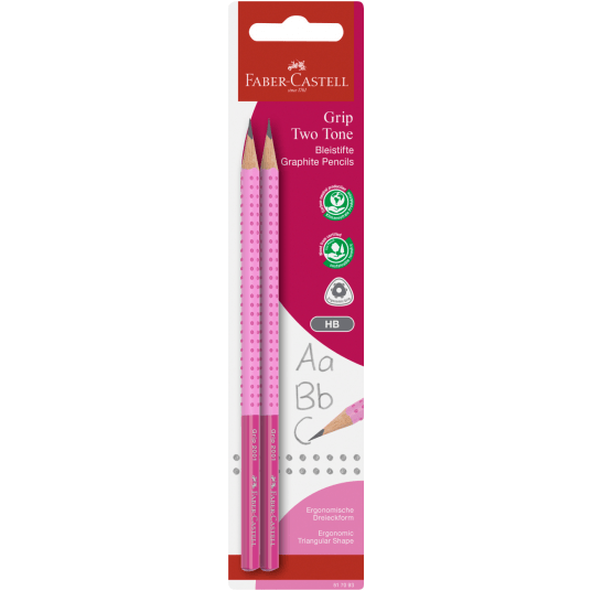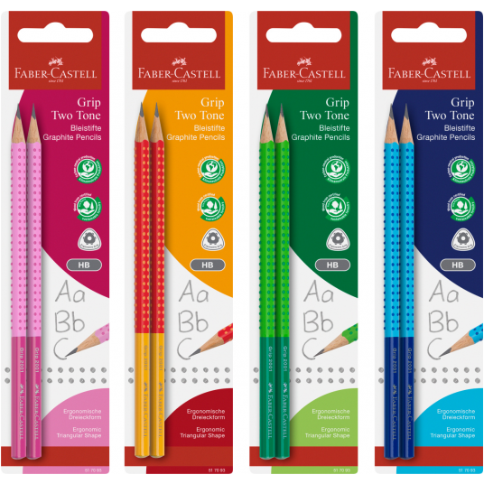 Ołówek grafitowy Grip 2001 Two Tone FABER-CASTELL. Opakowanie blistrowe 2 szt. Mix 4 kolorów. Popularny ołówek grafitowy w nowym wyglądzie o ergonomicznym trójkątnym kształcie. Z opatentowaną strefą GRIP z małymi antypoślizgowymi punktami, które zapewniają pewny uchwyt. Powierzchnia pokryta lakierem na bazie wody – bezpiecznym dla środowiska. Odporne na pękanie. Stopień twardości grafitu: B. Różne kolory: czerwono-pomarańczowy, jasnoniebieski-niebieski, jasnozielony-zielony, różowo-różowy.
