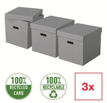 - Zestaw trzech małych tekturowych pudełek do przechowywania ze stylowym i nowoczesnym geometrycznym wzorem na powierzchni - Idealnie nadają się do zapakowania prezentów lub do przechowywania zdjęć, dokumentów i innych drobnych przedmiotów - Można je używać oddzielnie lub ustawiać na półkach - Pudełko może posłużyć do zapakowania prezentu, a obdarowany będzie mógł ponownie je wykorzystać do przechowywania drobnych przedmiotów w domu - Zdejmowana pokrywa pozwala na ukrycie zawartości pudełka i jego zamknięcie - Neutralne kolory i deseń dopełnią wystrój każdego wnętrza i pozwolą na łatwe dopasowanie pudełka do prezentu - Dostarczane rozłożone na płasko, do samodzielnego złożenia - Składanie jest szybkie i proste - Po złożeniu boki pudełka tworzą podwójne ścianki, dzięki czemu pudełka są mocne i dobrze chronią zawartość - Łatwa od utrzymania w czystości powierzchnia - Wykonane z mocnej i wytrzymałej tektury, w 100% pochodzącej z recyklingu i w 100% nadającej się do ponownego przetworzenia - Posiada certyfikat FSC - Opakowanie w 100% wykonane z materiałów pochodzących z recyklingu i w 100% nadaje się do ponownego przetworzenia, nie zawiera plastiku