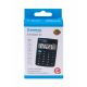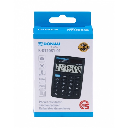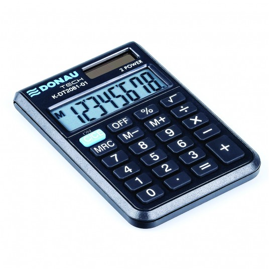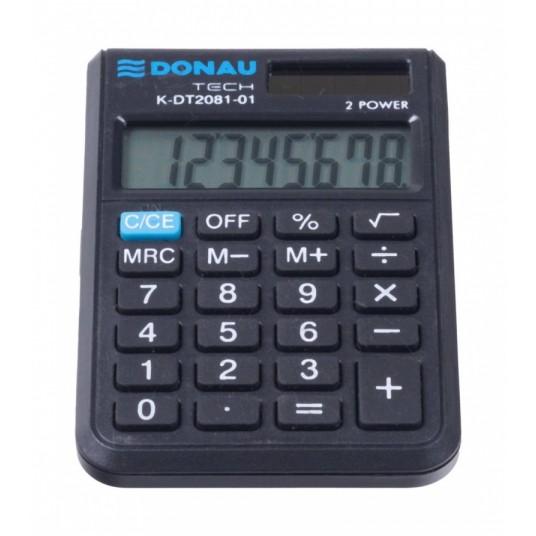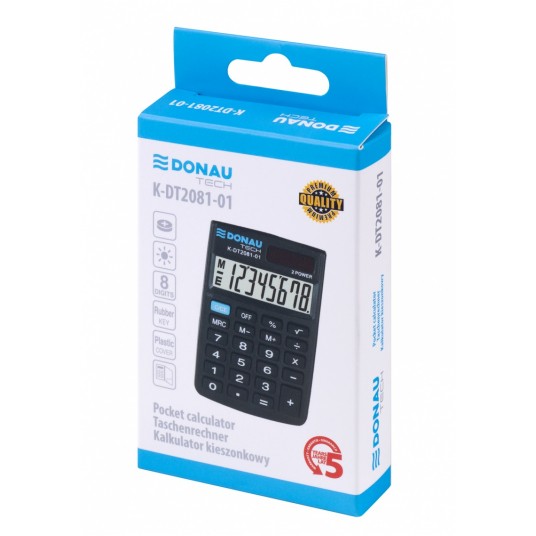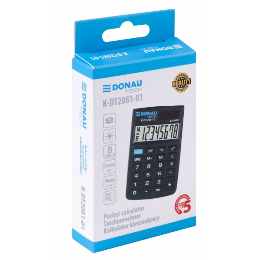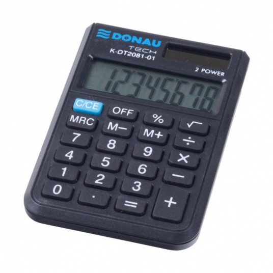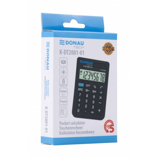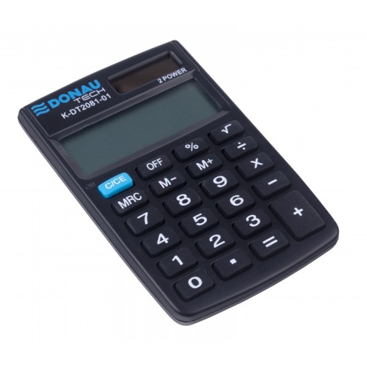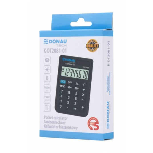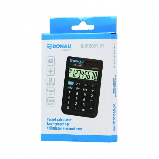 - kalkulator kieszonkowy z 8-cyfrowym wyświetlaczem z zasilaniem bateryjno-solarnym - wymiary: 90 x 60 x 11 mm - funkcja pierwiastka kwadratowego oraz obliczania procentów - wyłącza się automatycznie - 5 lat gwarancji - kolor: czarny