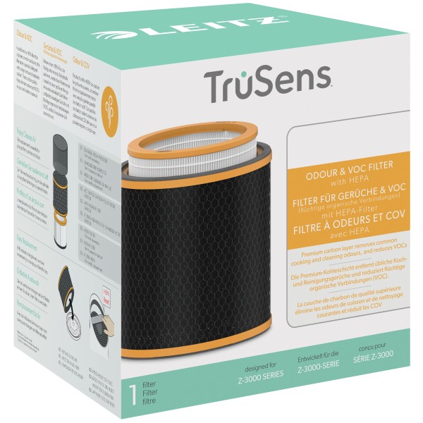 3-warstwowy filtr węglowy w granulkach otacza filtr HEPA, zapewniając niezrównaną skuteczność w usuwaniu zapachów i lotnych związków organicznych System filtracji 360 stopni zasysa powietrze ze wszystkich kierunków, zbierając zanieczyszczenia z całego pomieszczenia Wskaźnik na oczyszczaczu informujący o potrzebie wymiany filtra podświetla się na czerwono, gdy filtr wymaga wymiany Aby uzyskać najlepsze rezultaty, wymieniaj bębnowy filtr zapachów HEPA co 12 miesięcy (w zależności od intensywności użytkowania) 20,87 x 21,2 cm Do używania z oczyszczaczami powietrza TruSens Z-3000 / Z-3500 Przeznaczony do oczyszczania powietrza z zapachów i lotnych związków organicznych Opakowanie zawiera: 1 x filtr wstępny z siatki mesh, 1 x filtr węglowy, 1 x filtr HEPA Tylko filtr wstępny z siatki mesh przeznaczony jest do mycia