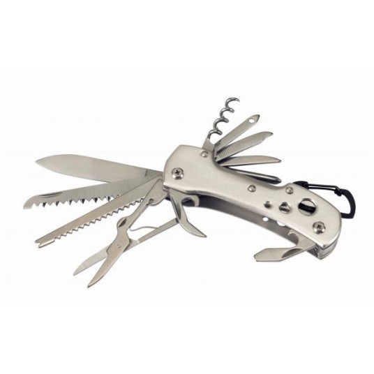 - Scyzoryk STRONG HELPER składa się z 12 elementów: nożyka, piły, nożyczek, otwieracza do puszek, korkociągu, otwieracza do butelek, śrubokręta płaskiego, śrubokręta krzyżakowego, szpikulca-rozwiertaka, szydła, linijki, pilniczka oraz karabińczyka.