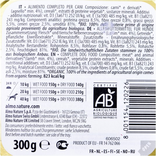 - Skład: mięso i produkty uboczne pochodzenia zwierzęcego* (jagnięcina min. 4%), zboża*, roślinne ekstrakty białkowe*, minerały (* składniki pochodzące z gospodarstw organicznych - FR BIO 10)