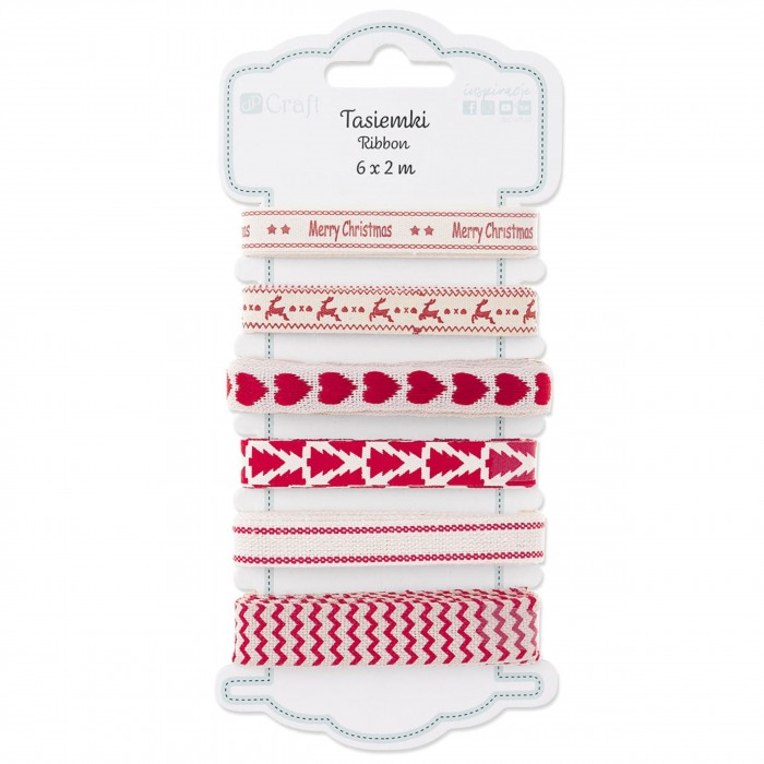 - Zestaw bawełnianych tasiemek w kremowo-czerwonych kolorach z motywami jelonków, choinek, serduszek, świątecznych napisów i ozdobnych pasków - Tasiemki Festive Red będą prezentować się pięknie przy projektach w stylu rustykalnym, vintage, eko i z wykorzystaniem kraftowych, brązowych papierów oraz kartoników - Będą również doskonałym dodatkiem do rozmaitych projektów typu home decor, scrapbooking i cardmaking. - Liczba tasiemek w opakowaniu: 6 - Długość tasiemek: 2 m - Szerokość tasiemek: 1 cm i 1,5 cm - Kolor: kremowy, beżowy, czerwonym - Cechy szczególne: szorstka, bawełniana faktura, doskonała do projektów w stylu vintage